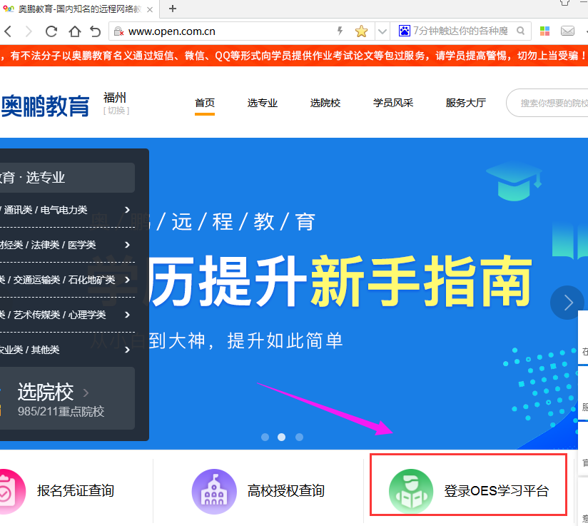 1、登录学习平台,打开网址:www.open.com.cn,点击【登录OES学习平台】,选择【学生入口】,输入学习平台账号密码,若不记得账号密码可以用手机验证登录或找招生老师要。